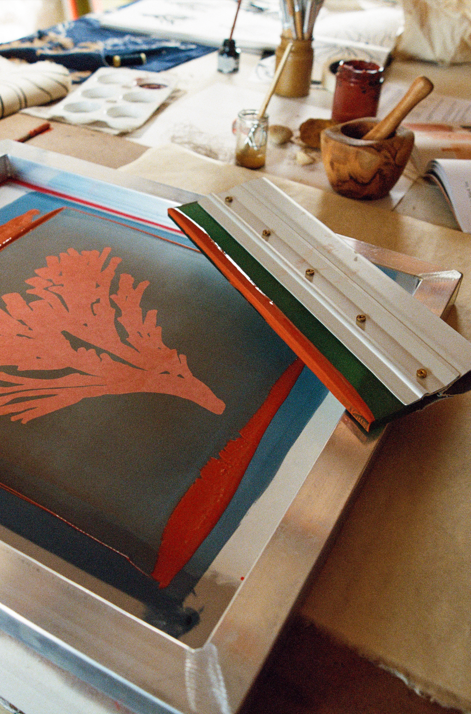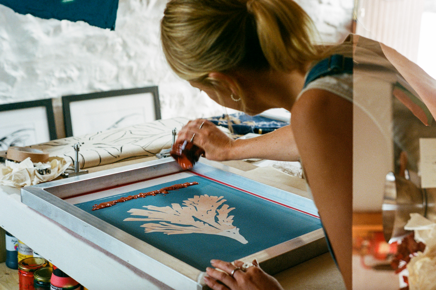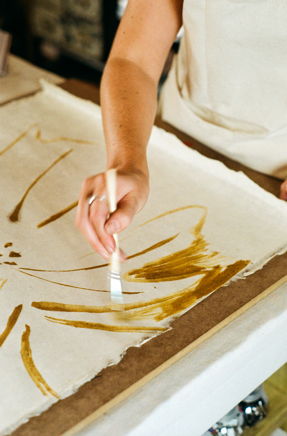 Through her practice, she celebrates the healing qualities of art, offering a personal yet meaningful exploration of the imperfect and the organic. Her process begins with spontaneous ink and charcoal drawings on large rolls of paper, encouraging fluidity and embracing imperfections that often lead to her most treasured pieces. Her passion for screen-printing enables her to transfer these raw, expressive drawings onto textiles, where the brushstrokes and painterly marks from her original drawings are preserved, becoming a defining feature of her work and an embodiment of her connection to place and process.